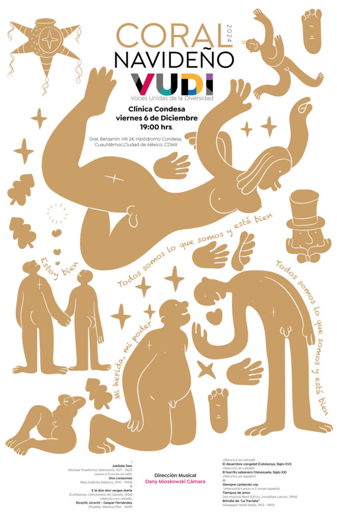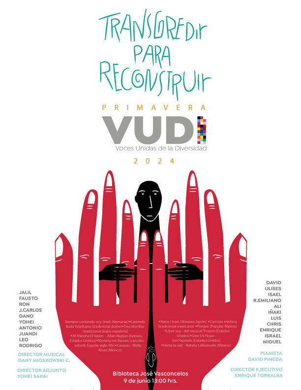 VUDI es concebida por Enrique Torralba, apoyándose en la enorme capacidad profesional y la relación amistosa de veinticinco años con el pianista y director coral Dany Mioskowski Cámara, sosteniendo desde hace tiempo la idea de formar un coro de la diversidad, se coquetea con la idea en el 2022 y se le va dando forma durante el desarrollo de otro proyecto coral hermano (ECO) sentando las bases y diseñando la estructura base de VUDI, a partir de los primeros meses de este año, se retoma la idea y acelera el nacimiento del proyecto motivando por un cambio profesional de Dany Mioskowski, se diseña el proyecto base, queremos que las personas vengan, que no importe que tengan o no experiencia musical, no hará falta audición, confiemos en las voces y empoderemoslas, esa fue la clave, yapoyados en la máxima del gran músico Zoltan Kodály (Músico Húngaro creador de la pedagogía Kodály que utilizamos como recurso para la formación musical de nuestros integrantes) “Que la Música sea para todos”, y con esa idea firme se lanza el proyecto y se difunde entre personas cercanas, amigos y grupo de conocidos. Poco a poco las primeras voces se enlistan, algunos de forma dudosa o titubeante, pero siempre procurando atenderlos personalmente y despejar sus dudas, es así que con la confianza ganada, llevamos a cabo nuestro primer ensayo el 5 de julio del 2023 con casi 20 voces que se reunieron entusiasmados, hasta el momento llevamos siete ensayos con un diseño de repertorio pensado en nuestra presentación debut, planeado para diciembre del 2023, la respuesta de los chicos nos ha inspirado y entusiasmado enormemente, creemos en el proyecto y no dudamos ni por un segundo que nos ganaremos un espacio importante y seremos un representante digno del trabajo comunitario LGBTTTIQ+ de la ciudad de México.